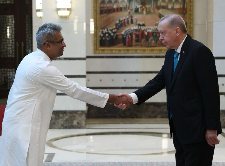 அங்காரா: துருக்கியே குடியரசின் இலங்கைத் தூதர் நிலுகா கதுருகமுவா, துருக்கியே குடியரசின் தலைவர் ரெசெப் தையிப் எர்டோகனிடம், வியாழக்கிழமை, அக்டோபர் 16, அங்காராவில் உள்ள ஜனாதிபதி வளாகத்தில் தனது நற்சான்றிதழ் கடிதத்தை வழங்கினார்.