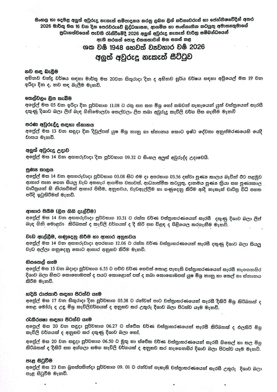 புத்தசாசன, சமய மற்றும் கலாசார அலுவல்கள் அமைச்சினால் இந்த சுபநேர அட்டவணை வெளியிடப்பட்டுள்ளதுடன், அது கீழே தரப்பட்டுள்ளது,